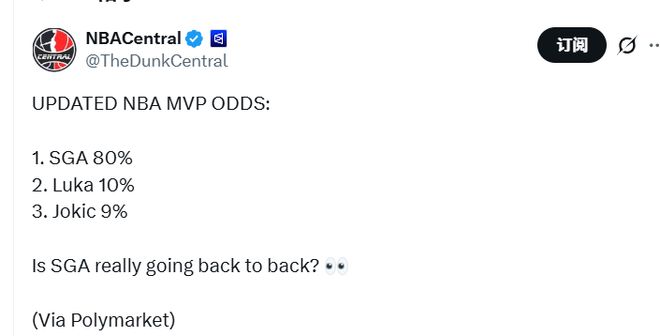若約基奇失去獎(jiǎng)項(xiàng)評(píng)選資格,他連續(xù)7次入選最佳陣容的紀(jì)錄將就此終結(jié),連續(xù)5年在MVP評(píng)選中位列前二的表現(xiàn)也將中斷。體育預(yù)測(cè)平臺(tái)Polymarket更新了本賽季當(dāng)選常規(guī)賽MVP的球員概率,其中亞歷山大以80%居首,東契奇10%排名第二,約基奇9%位居第三。而在約基奇受傷前,該平臺(tái)上約基奇的當(dāng)選概率是47%,亞歷山大是43%。